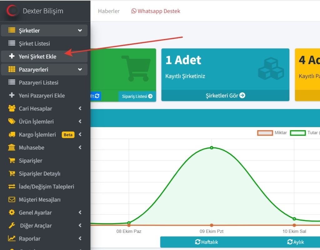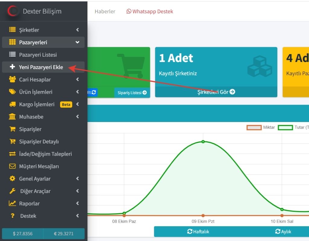 Dexter Bilişim Entegrasyon Paneli'ne giriş yapın, menüsünden "Pazaryeri Ekle" düğmesine basın.